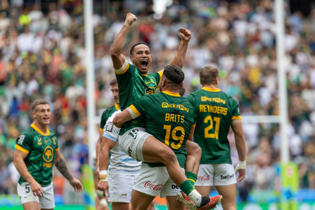 Si le seizième homme existe parfois en rugby à XV, en Afrique du Sud, c’est le huitième homme qui a fait la différence ce week-end lors de l’étape de Cape Town. Transcendés par leur public, les Blitzboks ont conservé leur titre à domicile, eux qui s’étaient imposés contre la France l’année dernière. Après leur cinquième place à Dubaï, les Sud-africains ont réalisé le tournoi parfait en demeurant invaincus au Cape Town Stadium. Pourtant, basculés dans une poule particulièrement difficile, les joueurs de Philipp Snyman se sont fait quelques frayeurs, mais ont fini par dominer les Fidji dans un duel de choc d’entrée (24-21), avant de l’emporter également d’une courte tête contre la Nouvelle-Zélande (19-14). La rencontre contre la Grande-Bretagne fut elle plus facile à maîtriser pour rejoindre les demi-finales (41-5). Opposés à la France, les Blitzboks entamaient la rencontre de la meilleure des manières grâce à deux essais de Shilton Van Wyk et Tristan Leyds. Heureusement, les Bleus réagissaient par Jordan Sepho et Josselin Bouhier, mais un doublé de Van Wyk distançait à nouveau les Français avant la pause (17-12). Un renvoi parfaitement capté par Bouhier que l’on retrouvait 60 mètres plus loin ramenait la troupe de Benoît Baby à égalité (17-17), mais l’agressivité défensive des Sud-africains eut le dernier mot. Ryan Oosthuizen offrait alors la victoire à son équipe (22-17) et le ticket pour une finale contre l’Argentine. Très bien rentrés dans cette rencontre, les Pumas scoraient tout d’abord par Luciano Gonzalez puis par Marcos Moneta. Du côté des Blitzboks, seul Donovan Don parvenait à se frayer un chemin dans la défense argentine pour un score de 7 à 14 à la mi-temps. Maintenant la cadence, les Argentins traversaient à nouveau le terrain grâce à Marcos Moneta qui signait un doublé. Mais l’abnégation des hommes en vert allait une nouvelle fois prouver son efficacité, notamment grâce au banc. Le jeune Sonwabo Soyoki, passé par le Monaco Rugby Sevens et qui disputait son premier tournoi, mystifiait ses adversaires pour le deuxième essai des siens (14-19). Quelques instants plus tard, c’est Christie Grobbelaar, lui aussi remplaçant, qui trouvait la terre promise (21-19). Héroïques ensuite en défense, les Blitzboks laissaient éclater leur joie au coup de sifflet final, dans un stade en folie !