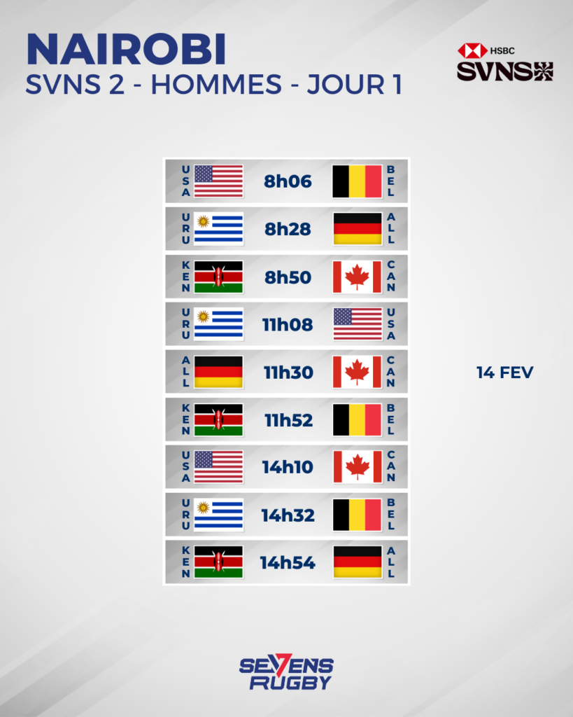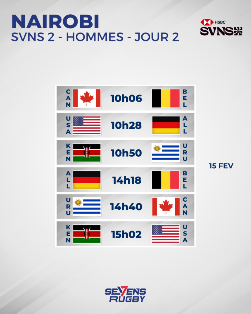 L’enjeu est donc majeur pour les équipes du SVNS 2 qui, pour certaines, ont été des membres importants du circuit mondial. C’est notamment le cas des États-Unis, qui ont connu un déclin ces dernières années, notamment la saison passée où ils ont terminé à la dernière place du classement général. Heureusement pour eux, ils s’étaient sauvés pour disputer le SVNS 2, en terminant en tête de leur poule de repêchage à Los Angeles, tout comme l’Uruguay, elle aussi reléguée en 2025. Le Kenya et l’Allemagne avaient eux dû s’employer lors d’un ultime match de montée pour garantir leur place en deuxième division. Mais ils avaient assuré en décrochant deux larges victoires, 24-5 pour le Kenya face au Canada, et 31-0 pour l’Allemagne contre les Samoa. Ces équipes ont été rejointes récemment par le Canada, vainqueur du SVNS 3 en janvier, et par la Belgique, finaliste, qui joueront toutes leurs cartes pour espérer réaliser le coup de l’année et passer du SVNS 3 au meilleur niveau mondial, en l’espace de quelques mois ! Un format original a ainsi été mis en place sur le HSBC SVNS 2, puisque toutes les équipes s’affronteront ce week-end pour réaliser un premier classement général. Découvrez ainsi les affiches du tournoi de Nairobi :